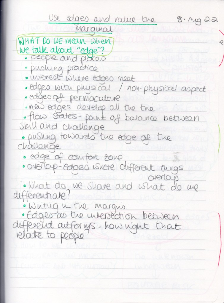 Use edges and value the marginal August 13, 2022August 13, 2022 lizpostlethwaite Notes from my Permaculture, Art and Imagination Guild, inspired by the Holmgren principle “use edges and value the marginal” Share this: Click to share on Facebook (Opens in new window) Facebook Click to share on X (Opens in new window) X Like Loading... Related