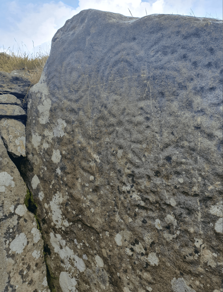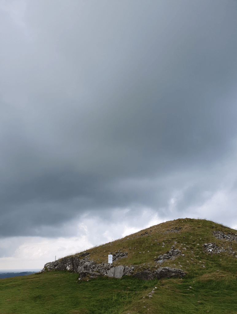 I am not sure what to expect when we clear the brow of the hill, but as we do a small fenced area comes into view with a gate in the corner. We go through this gate and as soon as we do that the peculiarities of this landscape really become apparent. Hummocks of grass that feel not quite natural, large pieces of rock in surprising configurations, and at the centre of it all a big pile of rocks which seems to be the most intact and recognisable structure in the space.