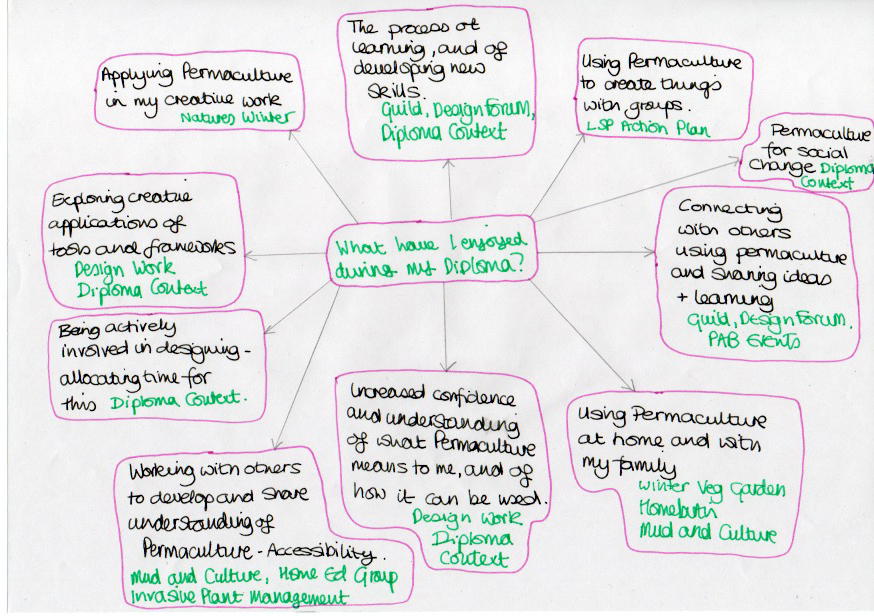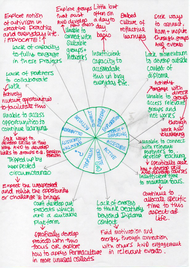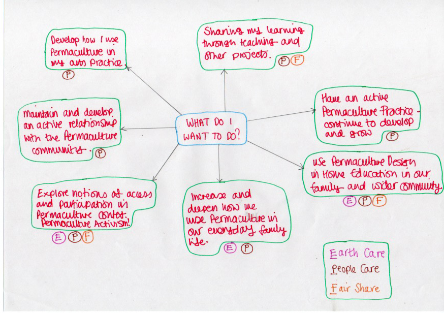| Personal – feelings, preferences and resources | – Sharing learning / teaching – Keeping connected to the Permaculture Community. What can I bring? – How can I maintain my Permaculture practice after the Diploma? – How can Permaculture Design influence our journey as a home educating family? – Permaculture Design in my creative practice – Wider development of practice particularly in community settings with focus upon accessibility – Permaculture in everyday life – deepen my sense of what that means and how that looks |