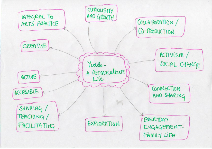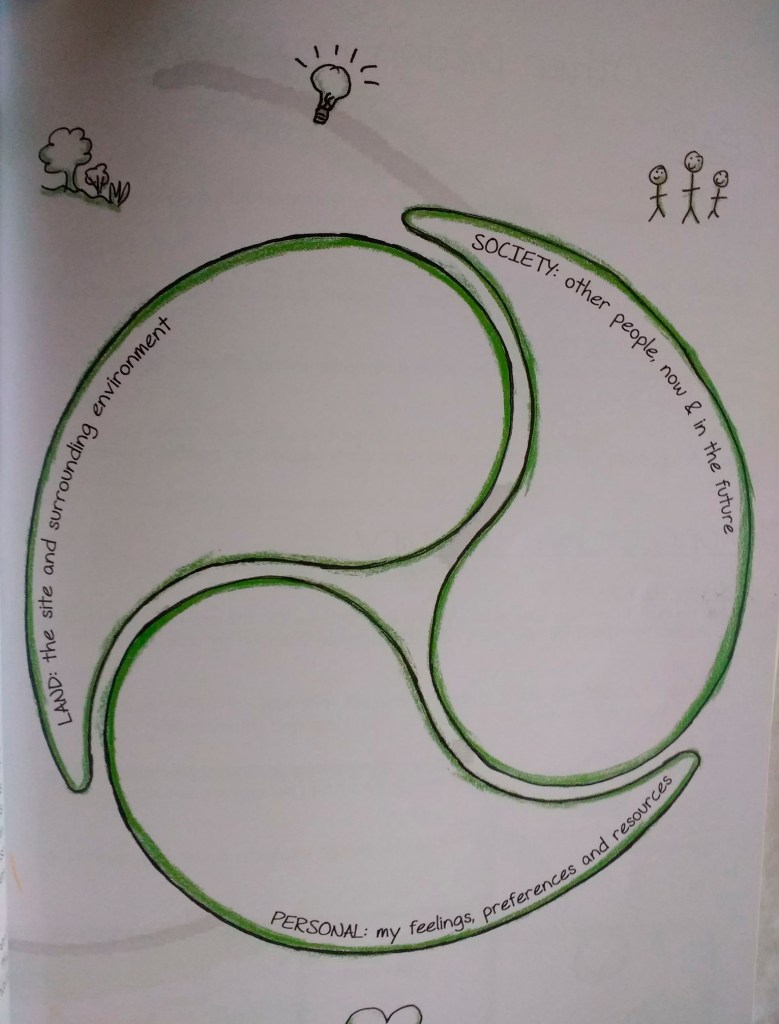 | Land – the surrounding environment | – Diploma in the context of my Applied Arts practice. – Professional role as practitioner, producer and creator – Volunteer involvement in projects in greenspaces and with local climate action groups – Home education context within our family – Permaculture within professional arts practice – where does it sit? – Lived everyday Permaculture – what does that mean? |