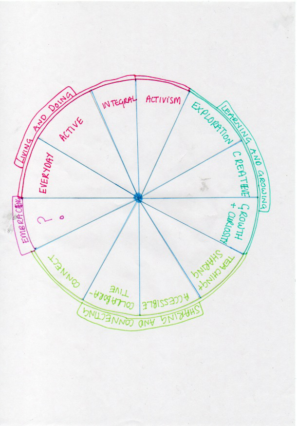 | Random Scatter | One of the key things that emerged within the Permaculture Wheel that I created is how important the unexpected has become to me throughout the Diploma – and the subsequent embracing of the unexpected! This has manifested itself in many different ways and it really resonates for me that it sits at the heart of this design in terms of allowing space for it, being open to what it brings, and celebrating the energy that it injects into things. |