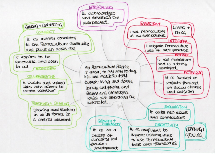 I then created a MIND MAP to think about loose ideas of aspects that I would like to feature in my Permaculture practice going forward, noting how the PERMACULTURE ETHICS may be reflected in these elements.