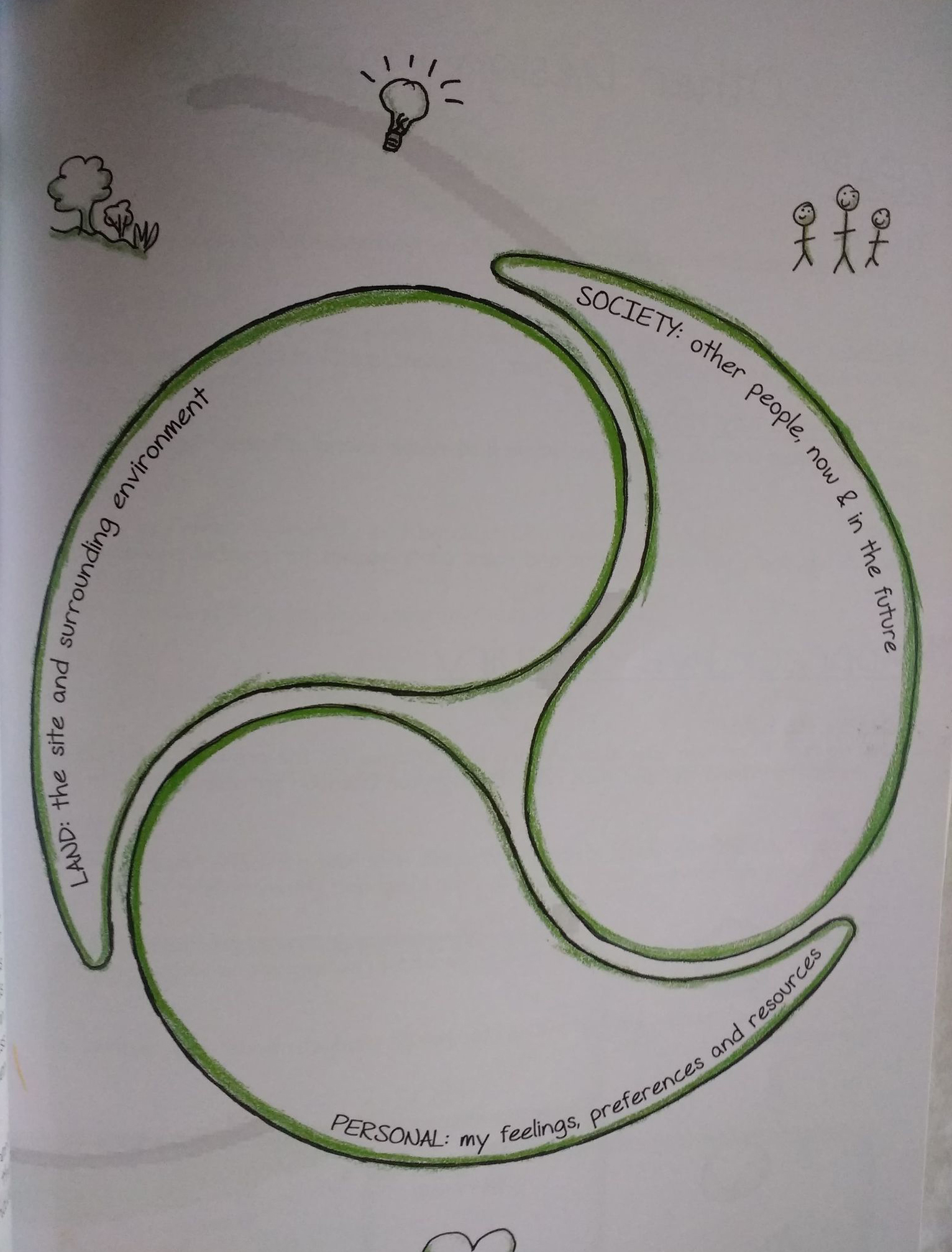 | Green – Ideas | – I liked developing the Permaculture Wheel which emerged organically during the design process. It has allowed me to visualise the emotional and conceptual elements of the design perfectly and is a good outcome of the design. | – It was great use the Patterns in Nature tool within the Discover aspect of the framework. I really like the way that it moves my thinking in many different directions which help me to think about things from a very different perspective, whilst also making a well rounded observation. |