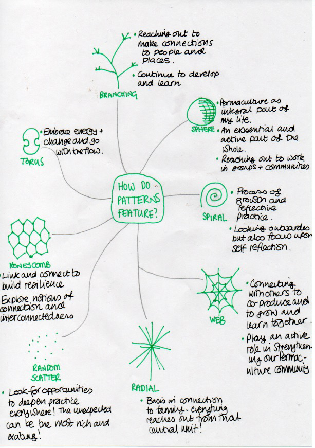 | Branching | Within this design I got a real sense of how Permaculture Design helps me reach to the light in terms of new ideas and thinking, but also how it helps me ground and root myself in my life. There is a deep sense of reaching out and connecting to new ideas and people but also to stretching down to put down roots. I love the way that it brings these things together for me, and in this design I got a real sense of that happening. |